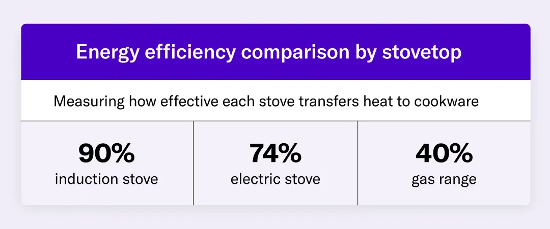 Since induction stoves create and transfer heat directly to where it is needed, less energy is required as an input. You can feel the difference while cooking. Gas stoves can increase ambient kitchen temperature by 6°F, compared with 1°F for induction stoves.